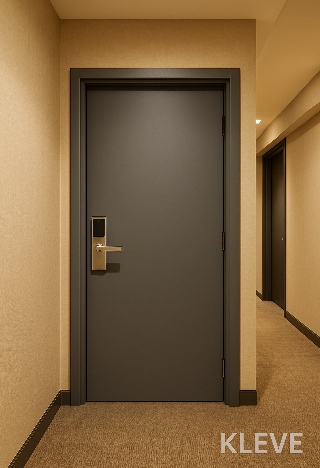 Pintu besi hotel produksi KLEVE dirancang untuk menghadirkan keamanan maksimal dengan tampilan modern yang elegan.